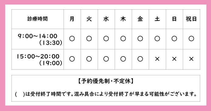 診療時間 土曜日・日曜日・祝日も営業しております。 定休日はございません。 お休みは前もってホームページ、 もしくはLINEで公開致します。 ご予約状況により、開院・閉院時間が変わることがございます。 事前のご予約をおすすめいたします。 いいね 読み込み中…
